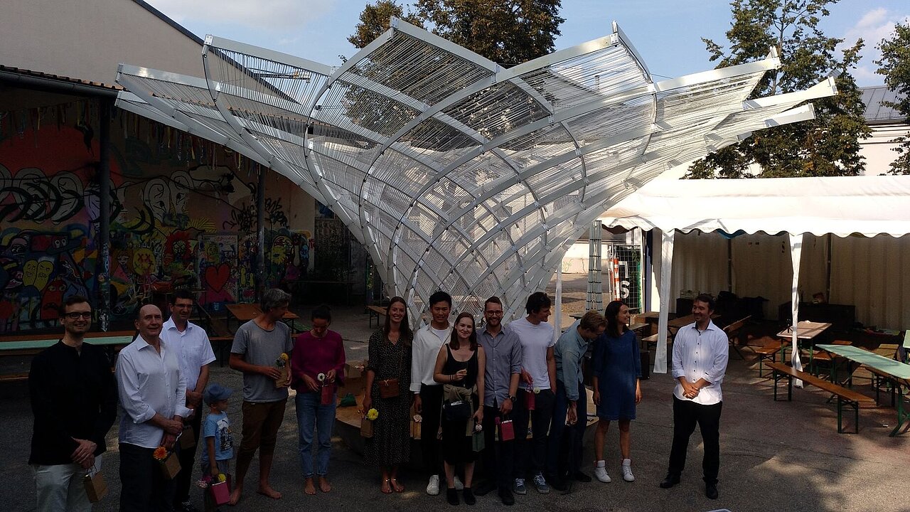 This innovative construction method is the result of previous research and development as part of student project work, theses, and doctoral dissertations. It combines geometric approaches, principles of lightweight construction, and simple constructive solutions. The goal is to generate spatially transformable supporting structures using simple means and low material usage. The Kinetic Umbrella changes its shape from a 6.5 m high cylinder to an umbrella with a diameter of 8 m. The supporting structure, made of straight GFRP rods, is elastically bent into a spatial form. Following geometric-mechanical rules, a grid with clearly defined deformability is created, which is set in motion via a cable system (actuator system). The structure is covered with an adaptive, textile sun protection system. Students are closely involved in the development, fabrication, and assembly, experiencing the practical connections between spatial geometry, elasticity, tension, and weight. The construction is part of a "research-by-design" process and will be put into operation at the event grounds of the Munich Creative Quarter following completion in summer 2021.