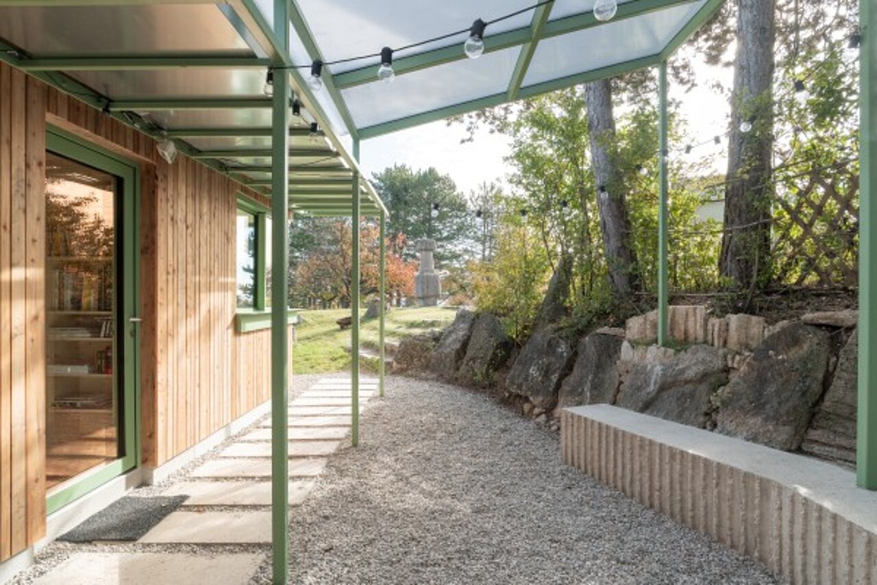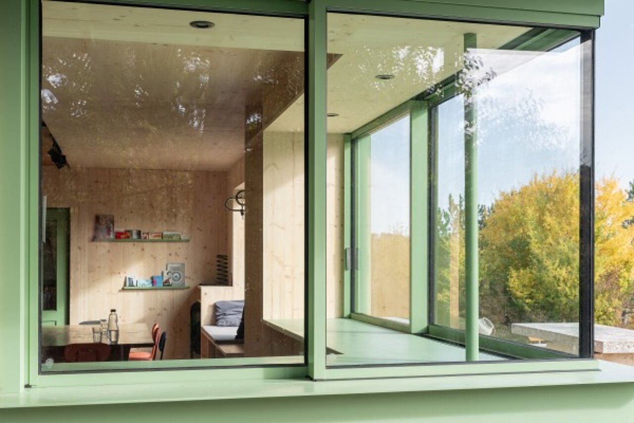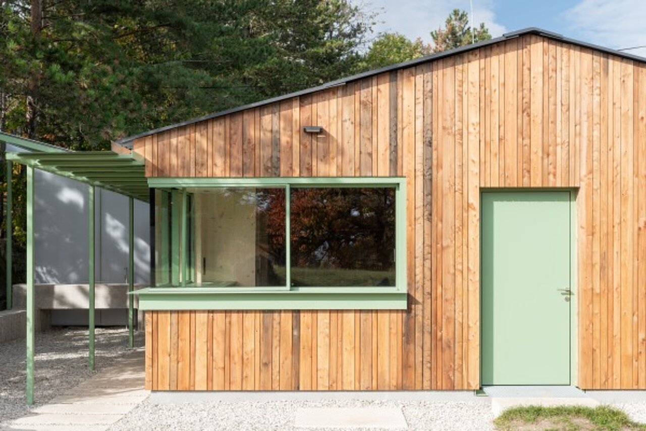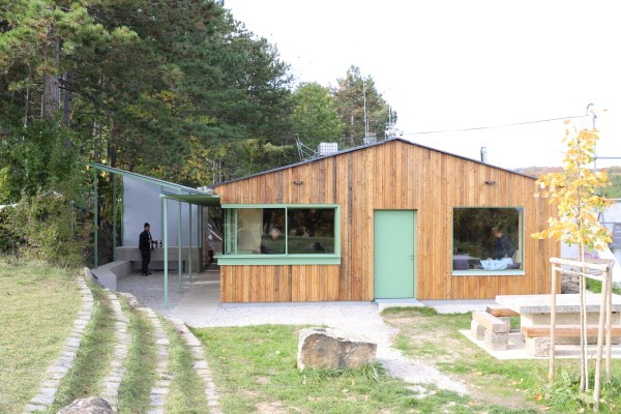 Im Wintersemester 2024/25 entwickelten die Studierenden im design.build studio der TU Wien unter Professor Peter Fattinger den Entwurf. Die Herausforderung: eine stark sanierungsbedürftige Baracke mit 150 Quadratmetern Grundfläche aus den 1980er-Jahren mit begrenztem Budget funktional und gestalterisch weiterzuentwickeln. Die Nachwuchstalente versetzten die Frontfassade zwei Meter nach vorne. Das schafft Raum für einen lichtdurchfluteten Gemeinschaftsbereich. Ein großformatiges Sitz- und Liegefenster verbindet Innenraum- und Außenanlage, ein Eckfenster mit Schiebeflügeln dient bei Veranstaltungen als Ausschank.