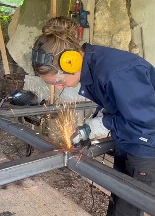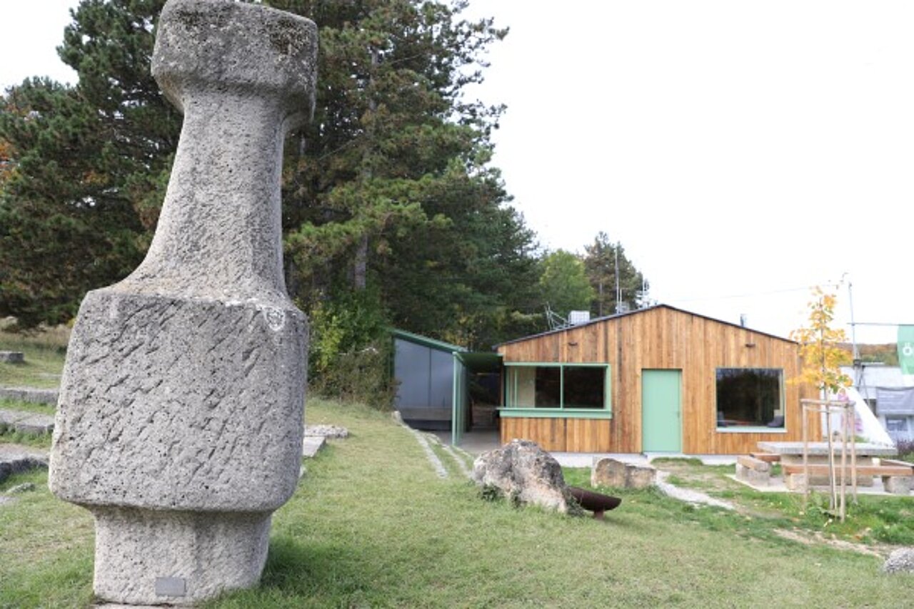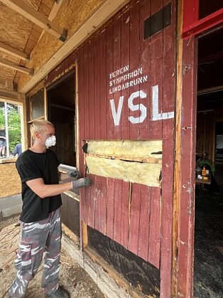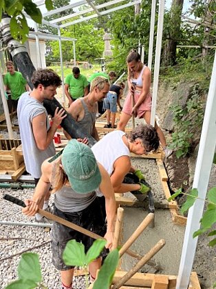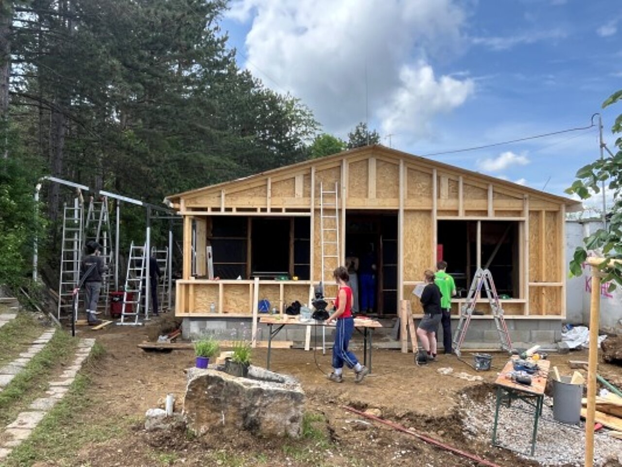 Im Sommersemester 2025 folgte die Bauphase. Die Studierenden rissen die alte Fassade ab, schweißten eine Stahlkonstruktion für die wettergeschützte Freifläche, gossen monolithische Betonelemente für Freiluftküche und Sitzbank. Sie schliffen die Oberflächen des Ökobetons von Hand ab, die auf den lokalen Lindabrunner Konglomeratstein Bezug nehmen. Das Gestein wurde durch die jährlichen Bildhauersymposien bekannt, die von 1967 bis 1997 im Skulpturenpark stattfanden.