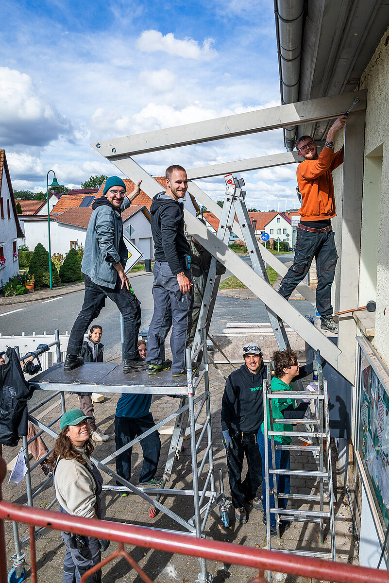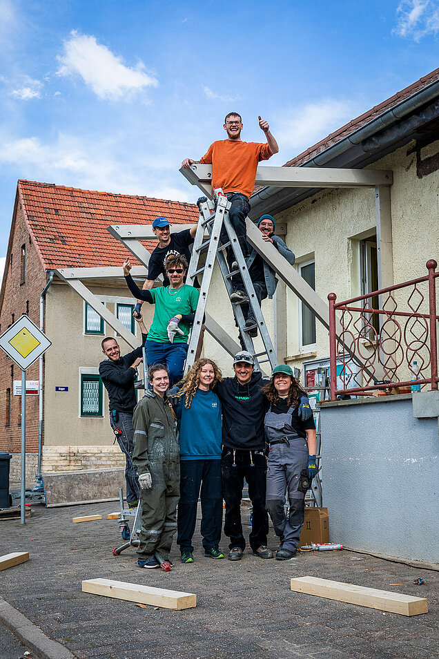 Zwischen Schleifpapier und Akkuschrauber sorgte das gemeinsame Kochen und Essen für einen abwechslungsreichen internationalen Austausch: Jeden Tag kochte ein anderes Team und brachte Rezepte aus der eigenen Heimat auf den Tisch. Die Teilnehmenden tauschten sich nicht nur über Bauthemen, sondern auch über Gewürze, Gewohnheiten und Geschmäcker aus. Den krönenden Abschluss bildete eine gemeinsame Feier im Bürgersaal, bei der Studierende, Handwerksprofis und Menschen aus dem Dorf zusammenkamen. Sie erlebten einen Abend voller Musik, Gesprächen und dem Gefühl, Teil einer großen, internationalen Gemeinschaft zu sein.