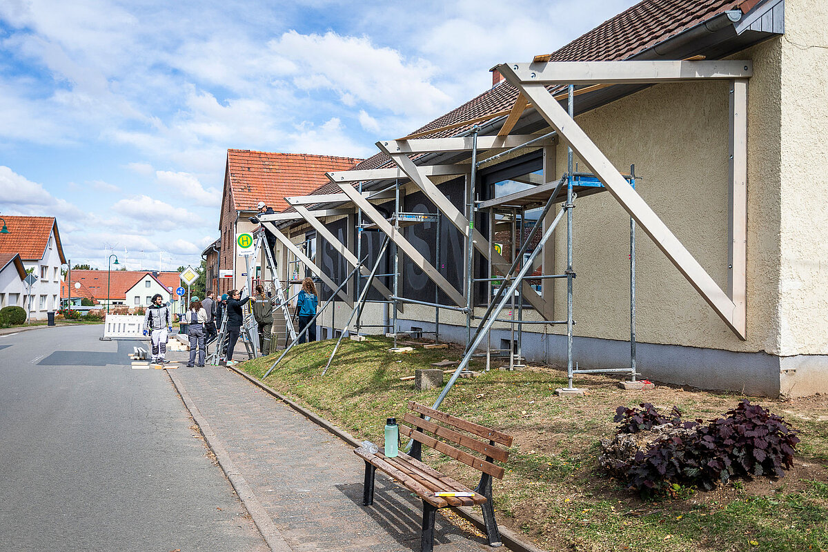 Leuchtend pinke Details bringen in diesem Herbst Farbe in den grauen Alltag: Die Fenster erhielten eigens gebaute Vordächer, aus demselben Holz entstanden ein Sitzplatz an der Bushaltestelle mit integrierter Tauschbox für Obst und Gemüse aus dem Dorf. Ein großes Stück der Außenwand bekam einen neuen Anstrich. Der ehemalige DDR-Supermarkt entwickelt sich immer stärker zum Schmuckstück der kleinen Gemeinde.